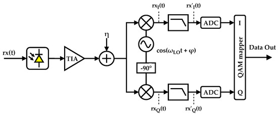 At the receiver side, independent devices need to demodulate a single band bearing in mind the IoT requirements of low cost and low power consumption. The receiver diagram is shown in Figure 4: the optical signal is translated to a current by a photodiode having a responsivity of ℜ, and a transimpedance gain, A, is applied. A noise source, , is added in order to include the system noise. The signal is then multiplied in each branch by a sinusoidal wave, with a phase shift of 90 between them, with angular frequency , plus a constant phase, . The mixing stage shifts the received signal to its baseband form. Following the mixing stage, a filtering stage with low-pass filters is used to remove both the undesired and imaging bands. The impulse response of the filters is denoted by . Analog-to-digital conversion occurs to sample the demodulated symbols at the rate R, which after a QAM de-mapping process, results, ideally, in the original data stream.