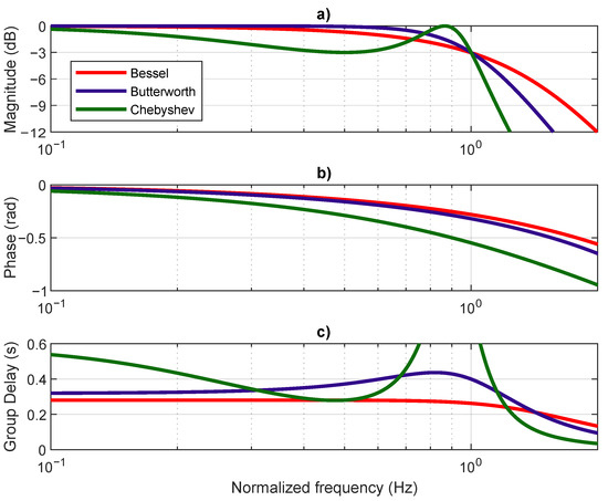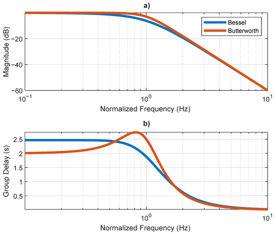 Unlike other filters, the Bessel filter −3 dB cut-off frequency is not constant with the filter order, leading to an attenuation higher than 3 dB at the desired cut-off frequency. The desire cut-off frequency can be determined asymptomatically by analyzing the high-frequency behavior [52]. In contrast with Figure 5, Figure 6 shows a Bessel filter where a high-frequency response is asymptotically coincident with the response of a Butterworth filter, both order three. This operation is achieved by normalizing the filter poles and gain, as described in [52]. An asymptotic analysis of the high-frequency response of the Bessel filter reveals a normalized cut-off frequency of 1 Hz, equal to the Butterworth filter. However, the magnitude at 1 Hz is −3 dB and −6.24 dB for the Butterworth and Bessel filters, respectively. The attenuation suffered by the Bessel filters in the asymptotic cut-off frequency increases as the filter order increases, which results in an increasingly non-flat amplitude response in the pass band, with increasing filter order. Both filters present non-flat group delay. Nevertheless, the Butterworth filter presents non-flat group delay at lower frequencies.