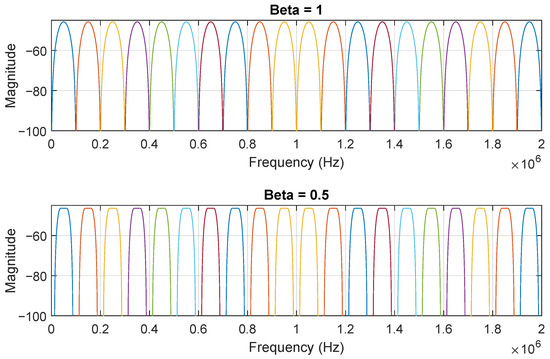 From Equation (22), the parameter assumes a value of 40. The total number of coefficients of the designed raised cosine filter is 401; hence, and will also have the same number of coefficients. In order to allow a fair comparison between the raised cosine filters and the matched filters, the same number of coefficients for all the simulation scenarios was considered, regardless of the used. The Figure 9 illustrates the matched filter generation steps.