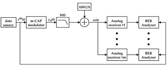 The proposed system was simulated in MATLAB® Simulink®. A block diagram of the simulation model is shown in Figure 8. The “data source” block generates the independent uniformly distributed pseudorandom symbols, , which are then modulated by the “m-CAP modulator”, resulting in the independent modulated bands, corresponding to the signal. A low-pass filter is added at the modulator output, which corresponds to , the combined impulse response of the DAC, LED driver, LED, and VLC channel. The VLC channel response is considered to be unitary. AWGN is added to the received signal, which is demodulated by the independent analog receiver. A BER analysis was performed at the output of each receiver, by comparing the demodulated data with the original data, for each band. The simulation ran until it reached one of two conditions: (1) 100 errors were found; (2) symbols were simulated. In order to guarantee good resolution for lower Eb/No, at least 2000 symbols were simulated for every point. Table 1 summarizes the general simulation parameters used in the simulation setup.
