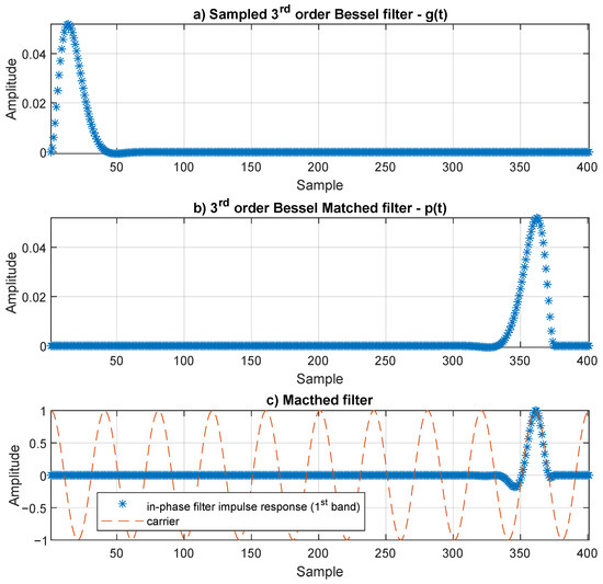 The generation of the matched filters considered the original analog filters’ impulse response. The impulse response of the analog filter, , was sampled at , and the obtained samples (Figure 9a) would directly be the coefficients of an FIR filter, which were time reversed. Moreover, in order to guarantee synchronism between the matched filter impulse response and the carrier, a negative delay was introduced: by doing this, the filter coefficients were shifted to the left side. The remaining coefficients, at the end, were set to zero (Figure 9b). Considering that is a third-order Bessel filter, the matched filter, , generation is shown in Figure 9, as well as the first band in-phase filter impulse response of the m-CAP modulator (Figure 9c).
