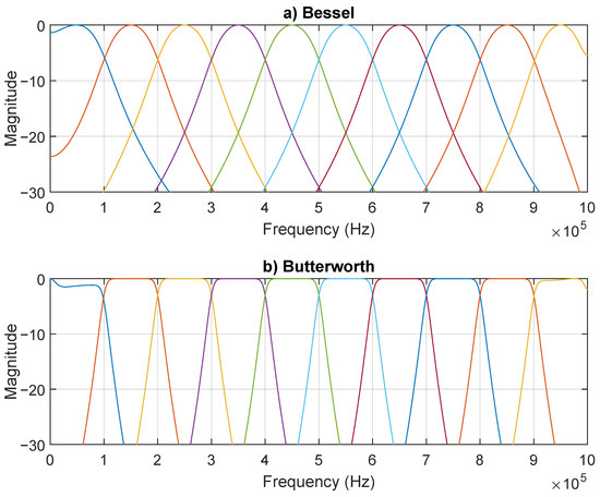 Previously, Figure 7 presented the frequency spectrum for when was a raised cosine filter. Figure 10 shows the output signal normalized frequency spectrum, however using the generated matched Bessel and matched Butterworth filters as . As seen, the energy was more spread in the case of the Bessel when compared with the Butterworth.