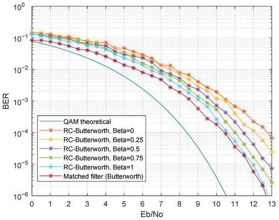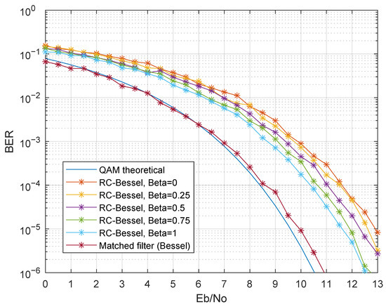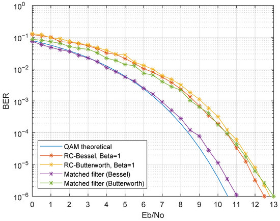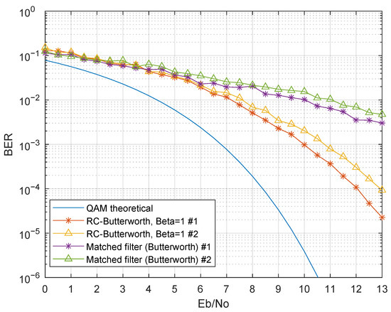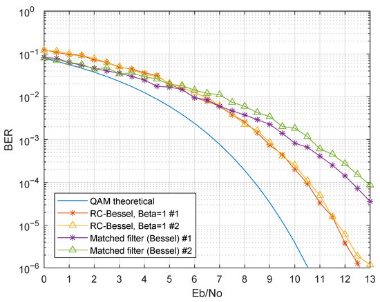 The first presented results evaluated the performance with only one modulated band, in particular the first band. Therefore, inter-band interference was not present in these results. Figure 11 presents the simulation results considering as a third-order Bessel filter, for various (Simulation Numbers 1 and 2 of Table 3). Regarding the raised cosine filter, there was a BER degradation as decreased. This was mainly due to the raised cosine impulse response change as changed: lower roll-off factors had a higher ripple in the impulse response, thus resulting in higher ISI in non-ideal scenarios, in particular when was not a matched filter and did not guarantee ISI-free communication. The matched filter in the receiver presented an improved BER when compared to the raised cosine filter, as expected. The simulated BER curve of the matched filter was almost coincident with the theoretical QAM BER curve for the same Eb/No, showing a remarkable improvement when compared with the RC-Bessel setup.