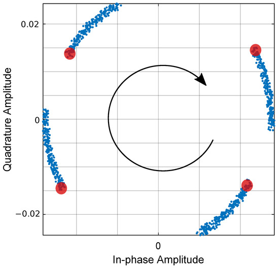 Received QAM constellation for the first 1000 symbols in the first band, showing constellation rotation in the presence of a frequency shift in the receiver Local Oscillator (LO), of 5 Hz @ = 50 kHz: red circles, received symbols without frequency shift; blue points, received symbols.