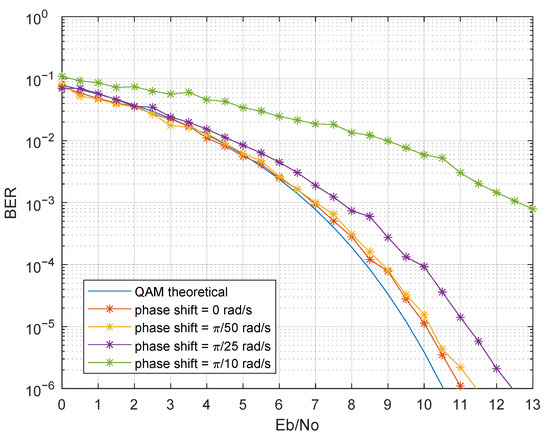 The proposed system uses a local oscillator that may present non-ideal parameters, namely: (i) frequency shift, (ii) phase shift, and (iii) phase noise. The following analysis considered the non-ideal parameters in synchronization in the scenario of Simulation 10. Regarding frequency shift, the system was highly sensitive if the frequencies of the local oscillator, , and the emitter filter sine wave, , did not match. Exact oscillator frequency is not feasible in real implementations due to component tolerances and thermal effects. From Equations (15) and (16), the sine and cosine terms only canceled out if both frequencies were exactly the same. In the case of a frequency shift at one of the sides, a cumulative phase delay was added; hence, the received constellation was continuously rotating (Figure 16). Without the presence of a proper carrier recover scheme in the receiver, the symbols’ demodulation can not be correctly performed. Furthermore, phase shift, also known as phase offset, may arise in real implementations, resulting in a degradation of BER as the phase shift increases, as shown in Figure 17.