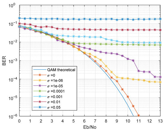 Both problems can be solved with system synchronization, which can be accomplished using the carrier frequency recovered from the suppressed carrier modulation, using for instance a Costas loop [54]. The synchronization will often actuate in a Voltage Controlled Oscillator (VCO) in a feedback loop, in order to match the LO frequency and phase with the carrier in the received signal. Hence, the resulting LO frequency will depend on the synchronism loop characteristic, resulting in voltage error and noise in the voltage at the VCO input, considered to be AWGN with zero mean and variance . The noise at the VCO input will cause a fast switch in VCO synthesized frequency, introducing phase noise in the demodulation. For simulation purposes, a VCO with a quiescent frequency Hz and a sensitivity of Hz/V was considered. Figure 18 presents the BER results of the considered scenario, varying the of the input voltage AWGN.