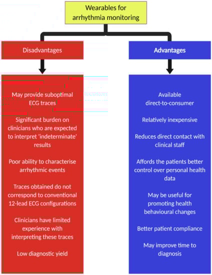 Over the past decade, there has been a surge in new wearables (e.g., patches and wristbands) that are capable of monitoring heart rate and ECG signals. The application of machine learning and artificial intelligence (AI) has further enhanced the role of these devices. Each offers a convenient, relatively affordable and directly accessible method of cardiac monitoring to the general public. Alongside an increase in consumers who are health-conscious or curious, these devices have been embraced with much enthusiasm. Table 1 summarizes different types of cardiac monitoring [2]. Advantages and disadvantages of wearables for arrhythmia monitoring are shown in Figure 1.