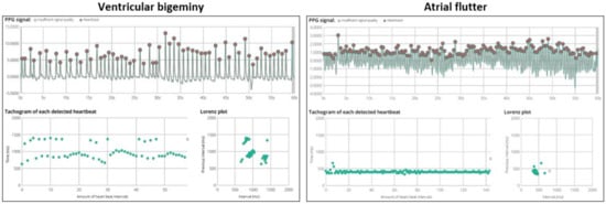 Examples of photoplethysmography (PPG) recordings for ventricular bigeminy and atrial flutter. The top graph shows PPG signals of a 60-s recording. The bottom-left tachogram displays all consecutive pulse signal intervals. For ventricular bigeminy, it can be seen that there are heart beats with alternating intervals. For atrial flutter, the heart rate is rapid with an average of 146 bpm. The Lorenz plot provides a visual representation for clustering patterns.
