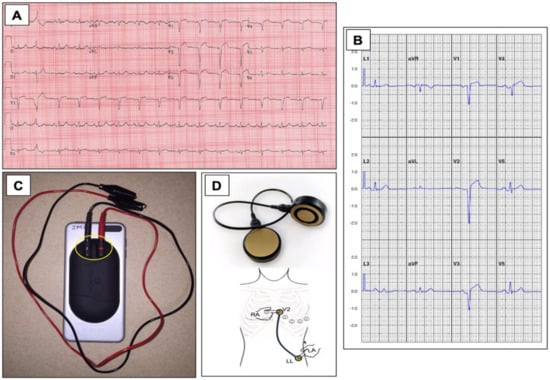 The figure shows a standard ECG (A) and a compared “12-lead equivalent ECG” (B) from the same patient using 2 electrodes connected to a smartphone associated sensor as shown (C) that obtains multiple sequential single-lead ECG measurements that was used in the St. Leuis trial. A next-generation concept for improved detection from AliveCor (Mountainview, CA, USA) is shown in (D) for smart phone-based cordless detection of STEMI with direct lead equivalents annotated. (Figures (A–C) are courtesy of Dr. Brent Muhlestein and Viet Le. Figure (D) is courtesy of Dr. Dave Alpert).