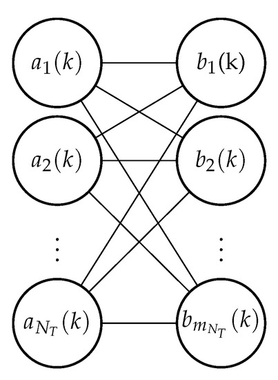 enforce consistency of the redundant association variables and describing the same association configuration, and and are the (unnormalized) single target data association probabilities obtained as explained in PDAF Section 3.1.3. Equation (44) can be expressed as the formulation of SPA for a bipartite model illustrated in Figure 1 in which all target association variables are connected to all measurement association variables . In this case, LSPA may be implemented via two half iterations, alternating between the two sets of messages and . The message updating equations according to Equations (39) and (40) can be given as