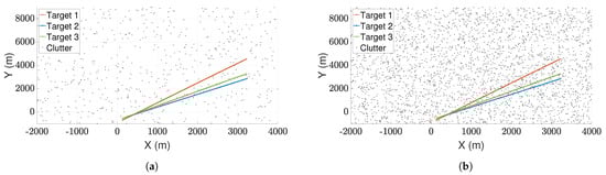True target positions for three crossing targets with different clutter densities. (a) Clutter density m; and (b) clutter density m.