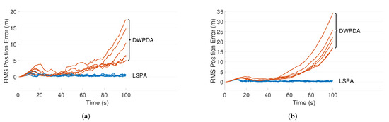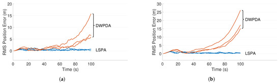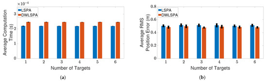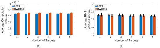 RMS position error for six crossing targets using DWPDA and LSPA with different clutter densities. (a) Clutter density m; and (b) clutter density m.