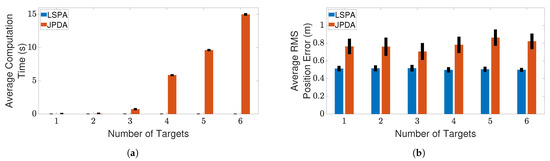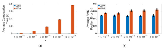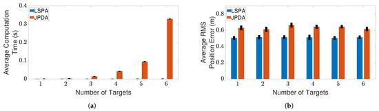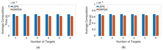Average computation time for obtaining association probabilities using DWPDA and LSPA for tracking multiple crossing targets with different clutter densities. (a) Clutter density m; and (b) clutter density m. Error bars indicate 95% confidence intervals.