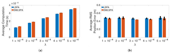 Tracking three crossing targets using LSPA and DWLSPA. (a) Average computation time for obtaining association probabilities; (b) average RMS position error. Error bars indicate 95% confidence intervals.