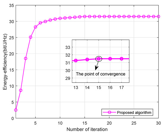 Figure 1 shows the increase of system EE during each iteration, and demonstrates the easy convergence of our proposed algorithm with = 30 dBm. As can be seen from Figure 1, the proposed algorithm converges after about iterations. As expected, the system EE obtained by our proposed algorithm monotonically increased with the number of iteration increases.