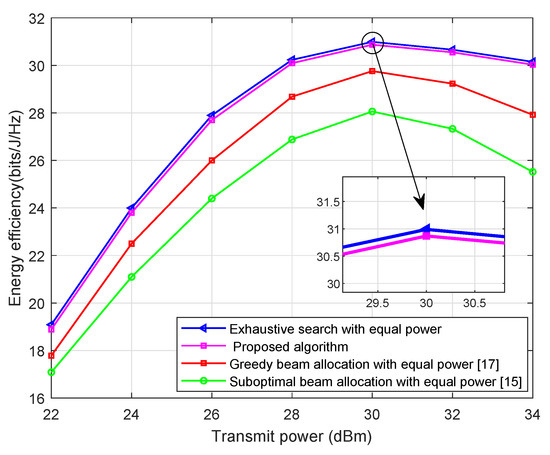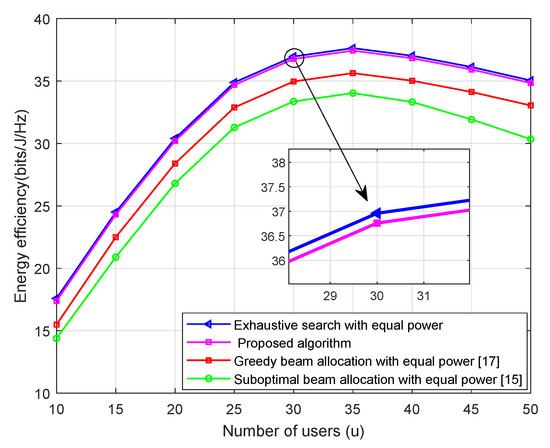 Figure 2 shows that the behavior of the proposed algorithm is almost the same as that of ES algorithm under wide transmit powers. For example, about 30.98- and 30.86-bits/J/Hz EE values were obtained by ES and proposed algorithms when the transmit power was 30 dBm. Besides, the result show that our proposed algorithm has better performance than that of the greedy beam allocation method (greedy beam allocation algorithm: First, each user is associated with its candidate beams with the highest directivity. Second, the greedy method is associate with every user u to the beam m that provides the highest received signal power at each step (i.e., )) [17] and suboptimal beam allocation method (suboptimal beam allocation algorithm: It employs a two-step scheme to solve the beam allocation problems. In the first step, each user is associated with the beam with the highest directivity. In the second step, there are U users in total, if a beam is associated with more than one user, then it is allocated to the user with the highest received signal power, where comparisons are needed to find the highest received signal power) [15]. For example, when transmit power is 30 dBm, the system EE by the proposed algorithm is higher than the greedy beam allocation method and suboptimal beam allocation method approximately by 1.23- and 2.91-bits/J/Hz, respectively. As expected, the system EE achieved by the four algorithms is slightly decreased when the transmit power goes large. This phenomenon is attributed to the transmit power increase which causes the the total power consumption increase, and leads to the decrease of the system’s EE.