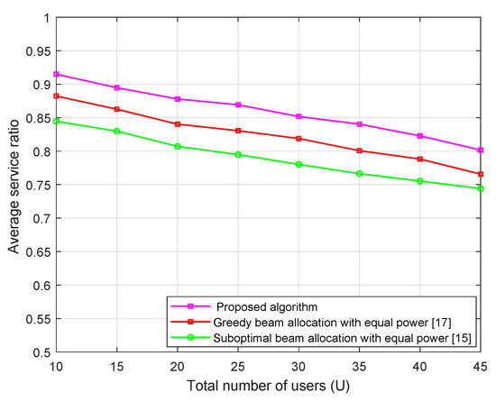Average service ratio versus total number of users U with , M = 64, = 30 dBm.