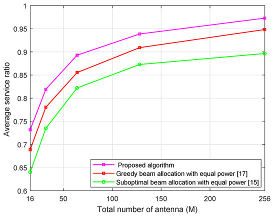 Average service ratio versus total number of antennas M with , U = 10, = 30 dBm.