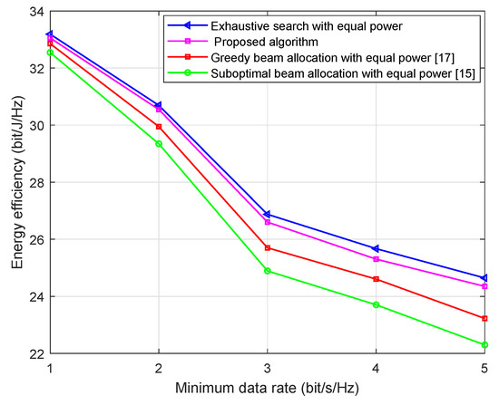 Figure 6 shows the system EE versus the required minimum data rate . The figure result show that the system EE of the compared four algorithms decrease as the minimum data rate increases. When the minimum data rate increases, the QoS constraints is maintained by the required multiple transmit antennas and larger power. This introduces a substantial decrease to the system EE. The gap between the four beam allocation schemes enlarges significantly as the minimum data rate increases. Again, the proposed algorithm provided better system EE than the greedy beam allocation method and suboptimal beam allocation scheme in terms of the system’s EE performance at the minimum data rate bit/s/Hz.