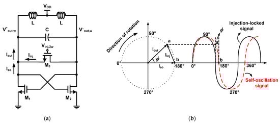 Figure 2a shows a schematic of the conventional cross-coupled pair ILFD with a second-order resonator. This ILFD consists of an N-channel metal-oxide semiconductor (NMOS) cross-coupled pair (M1, M2), injection switch (M3) and LC resonator. The ILFD self-oscillates if there is no injection signal at the gate of M3. Biasing the injection signal of Vinj,2w at the gate of M3, the ILFD outputs V+out,w and V−out,w. When the frequency of the output signal is exactly half the frequency of the injection signal, it is referred to as “locking”. To easily understand the locking operation, the current is classified into three types, namely, Iso, Iinj, and Iout. Iso represents the self-oscillation current flowing through the core when the ILFD self-oscillates without an injection signal. Iinj is the injection current flowing through M3 when an injection signal is applied. Iout is the output current, which is the sum of Iso and Iinj. Figure 2b shows the phasor diagram for the three current types. The phasor rotates clockwise. Point “a” shows that the phase has changed from Iso by ϕ. Point “b” shows the phase when the ILFD self-oscillates without an injection signal. The relational expression of the current vectors is as follows.