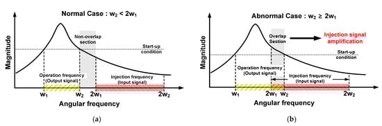 The power of the output signal should be greater than that of the input signal. Two graphs of the load impedance magnitude against the angular frequency are shown in Figure 3, which presents two cases. The first case is the normal case where the power of the input signal is significantly smaller than that of the output signal as shown in Figure 3a. The range from w1 to w2 is the operation frequency band obtained by dividing by two, and the range from 2w1 to 2w2 is the injection frequency band. The operation and injection frequency bands do not overlap in the normal case because 2w1 is larger than w2. Therefore, the input signal does not exceed the start-up condition and is not amplified more than the output signal. The second case is the abnormal case where the power of the input signal can be larger than that of the output signal, as in Figure 3b. Here, the operation and injection frequency bands overlap because 2w1 is smaller than w2. The injection frequency band contains the parts that exceed the start-up conditions, which are determined by the following “Barkhausen formula”.