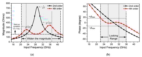 Figure 5 shows the magnitude and phase plots of the second- and fourth-order resonator-based ILFDs. The schematic of the second-order resonator-based ILFD is shown in Figure 2a. Figure 5a shows the graph of the load impedance magnitude against the input frequency. The second-order resonator-based ILFD has one pole, w0, that is expressed as follows.