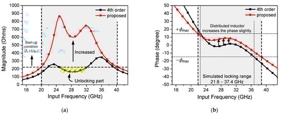 Figure 7a shows the simulated magnitude plot and phase plot of the fourth-order resonator-based ILFD and the proposed CR-ILFD with the fourth-order resonator with a distributed inductor. The start-up condition in Figure 7a is determined by the “Barkhausen formula” in (12). In the case of the fourth-order resonator-based ILFD, an unlocking part may occur because of the minimum value that is less than the start-up condition. However, the magnitude of the load impedance is sufficiently increased by using the inductor distributed technique. Figure 7b shows the slightly increased phase. This is not a critical amount of change because the phase ripple still exists between the ±ϕmax. The simulated locking range of the proposed ILFD is from 21.6 to 37.4 GHz, which is limited by the ±ϕmax in (11).