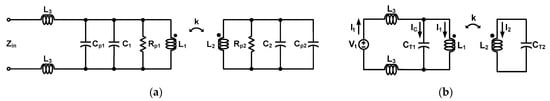 (a) Modeling of the fourth-order resonator using a transformer with distributed inductor. (a) Modeling of including the parasitic capacitors and resistors. (b) Approximate modeling applied to simplify calculations.