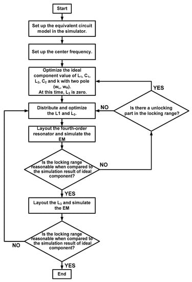 Figure 9 shows a flowchart of the design approach for the proposed CR-ILFD. First, the equivalent circuit model must be implemented in the simulator. Second, the values of the design parameters should be determined. In the proposed CR-ILFD, the center frequency is set to receive an injection signal of 28 GHz. Because the distributed inductor does not directly affect the pole value, the values of L1, C1, L2, C2 and k are first determined. Subsequently, L1 is divided into two series inductors, L1 and L3. In this design, L1, L2, and L3 are 230, 265, and 433 pH, respectively. C1 and C2 are 144 and 240 fF, respectively. The value of k is 0.51. When k < 0.5, which represents a weak coupling, the distance between the poles increases, and a wide magnitude plot of the load impedance can be obtained. However, a coupling that is too weak can cause an unlocking part in which the ILFD does not work. Considering the locking range and unlocking part, the proposed CR-ILFD is designed with a coupling factor of 0.51. Finally, the layout and locking simulation are repeated in the order shown in the flowchart. Electromagnetic simulation is essential in the mm-Wave band. Therefore, it should be ensured that the difference between the equivalent modeling and implementation in the simulation of this circuit is reasonable.