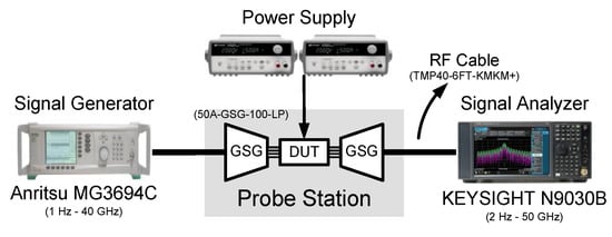 Figure 10 shows the die photograph of the proposed CR-ILFD, which was fabricated in a 65 nm CMOS technology. The die size including the entire pad is 0.75 mm × 0.45 mm and the chip size including the core and output buffer is 0.49 mm × 0.3 mm. The measurement setup for the proposed CR-ILFD is shown in Figure 11. The measurements were obtained using a probe station. The DC voltage was biased from the power supply. The CR core of the proposed CR-ILFD consumes 2.26 mW from a 1 V supply voltage, when no signal is applied to the injection switch. As Vinj,DC increases, the power consumption increases. When Vinj,DC is 0.7 V, the power consumption of the core increases by approximately 0.5 mW. The power consumption of the output buffer is approximately 3 mW. The injection signal was generated by Anritsu MG3694, which can generate frequencies up to 40 GHz. The output signal of the proposed CR-ILFD is analyzed by KEYSIGHT N9030B, which can analyze frequencies up to 50 GHz. When conducting measurements using mm-Wave signals, several losses occur around the device under test (DUT). Therefore, the calibration tests must be carried out carefully. In this measurement, the ground–signal–ground (GSG) probe tip has a loss of approximately 2.5 dB and that of the radio frequency (RF) cable has approximately 3 dB. Approximately a 1 dB loss occurs even when the signal generator output is 10 dBm. The loss of the signal generator was analyzed by connecting the signal analyzer and RF cable. All losses described above are based on the 28 GHz signal. Generally, the loss increases as the frequency increases, and decreases as the frequency decreases.