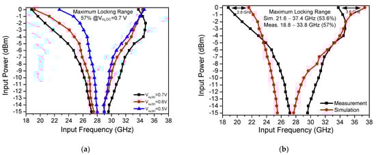 Figure 12a shows the measured locking range of the proposed CR-ILFD with different Vinj,DC values. The maximum locking range is from 18.8 to 33.8 GHz (57%) at Vinj,DC of 0.7 V. When the Vinj,DC is biased to 0.6 V, the locking range is from 19.2 to 34.4 GHz (56.7%), and when the Vinj,DC is biased to 0.5 V, the locking range is reduced from 22.7 to 34.6 GHz (41.5%). The above ranges were obtained from 0 dBm input power and 1 V supply voltage. As the Vinj,DC decreases, the locking range also tends to decrease. Figure 12b shows a comparison of the measured and simulated locking range results of the proposed CR-ILFD. The measured locking range is 57%, and simulated locking range is from 21.6 to 37.4 GHz (53.6%). When 0 dBm input power is injected to the CR-ILFD, the measured locking range is typically changed to a lower frequency band than the simulated locking range. The operating frequency band was lowered by approximately 3 GHz. This is because of various electromagnetic components, such as RF pads, printed circuit board (PCB), and metal lines that were not considered in the simulations. The measured maximum operation frequency is higher when the input power is −3 dBm compared to when the input power is 0 dBm. This is because of the saturation of the input signal level.