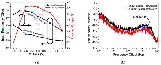 Figure 13a shows the measured maximum and minimum operation frequencies of the proposed CR-ILFD with different Vinj,DC values. This measurement was carried out with 0 dBm input power and 1 V supply voltage. Vinj,DC is swept from 0.4 to 1.2 V, and the widest locking range is obtained at the Vinj,DC of 0.7 V. When Vinj,DC increases from 0.7 V, the maximum and minimum operation frequencies decrease, and the locking range also decreases.