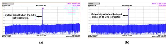 The measured phase noise of the input and output signal is shown in Figure 13b. The 28 GHz input signal is generated by Anritsu MG3694, which is applied to the proposed CR-ILFD and the output signal is 14 GHz. The phase noise of the output signal is −109.57 and −129.81 dBc/Hz at 100 kHz and 1 MHz offset frequency, respectively. The phase noise of the output signal should be measured at 6 dBc/Hz lower than that of the input signal because the input signal frequency is twice that of the output signal. Figure 14 and Figure 15 show the results of several spectrums of the CR-ILFD’s output signal measured using the KEYSIGHT N9030B. The spectrum of the output signal when the proposed CR-ILFD self-oscillates is shown in Figure 14a. The output frequency is 14.08 GHz, and output power is −10.45 dBm. If the loss of the RF cable and GSG probe tip is calibrated, the output power will be approximately −5 dBm. The spectrum of the output signal when the 28 GHz input signal is injected to the proposed CR-ILFD is shown in Figure 14b. The frequency of the output signal is 14 GHz, which is exactly half the frequency of the input signal. The output power is approximately −8 dBm with loss calibration. Figure 15a shows the full span spectrum when the minimum input frequency, 18.8 GHz, is injected. Three tones are visible in the spectrum: the output signal (f0), input signal (2f0), and harmonic signal (3f0). As shown in Figure 3, several harmonic components are amplified at output when the minimum input frequency is injected to the CR-ILFD. Locking is possible even if a lower input frequency is injected. However, the input signal is amplified such that the power difference from the output signal is less than 10 dB. When 18.8 GHz is injected, the power difference between the desired output signal and the harmonic signal is approximately 10 dB. Figure 15b shows the full span spectrum when the maximum frequency input signal of 33.8 GHz is injected. The power difference between the output and input signals is more about 20 dB. It can be observed that the amplified input signal is smaller when the maximum input frequency is injected than when the minimum input frequency is injected. As a result, harmonic rejection ratio of the input signal over the entire locking range is more than 10 dBc.