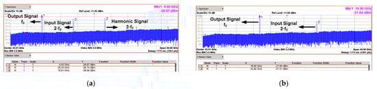 Full span spectrums (a) when the minimum input frequency is injected (18.8 GHz); (b) when the maximum input frequency is injected (33.8 GHz). The power difference between the output and input signals is approximately 10 dB or more.