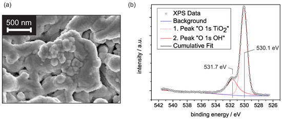 (a) SEM image of the Pt/PEO-TiO surface. (b) XPS spectra of the O 1s binding energy range for the PEO-TiO sample at room temperature. The first peak is centered around 530.1 eV and is assigned to O, while the second peak is centered around 531.7 eV and is assumed to originate from OH groups.