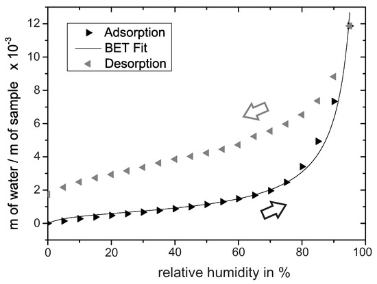 Water adsorption/desorption isotherm recorded at 30 reveals insights into the water adsorption process on PEO-TiO. The adsorption isotherm is additionally fitted by the BET equation.