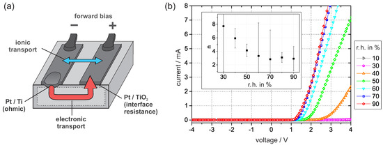 The sample setup is shown in Figure 3a. The Pt/Ti junction provides low ohmic resistance, while the dominant nonlinear resistance is associated with the Pt/PEO-TiO interface. I–V curves were recorded at defined levels of humidity in regular time intervals. Initially, when the dry nitrogen flow started, the I–V curves began to flatten. After more than 10 h, the current vanished within the resolution of the digital multimeter for applied voltages up to 4 . As shown in Figure 3b, the intensity of the curve increased again with increasing humidity in the nitrogen flow.