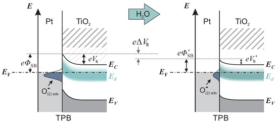 Intrinsic point defects in TiO, as oxygen vacancies V and titanium interstitials Ti, induce excess electrons, which can be thermally excited into the conduction band [27]. Therefore, TiO with oxygen deficit behaves as a n-type semiconductor. The corresponding electronic states are often summarized in a defect band , situated approximately 0.1 below with a maximum density of states appearing 0.9 below [28]. When a Pt/TiO junction is formed, an electron depleted layer within TiO evolves due to work function differences between Pt and TiO. The depletion layer induces a band bending , which represents a significant resistance for the electronic transport across the Pt/TiO interface. Oxygen ionosorption at three-phase-boundaries (TPBs), i.e., /Pt/TiO, described in Reactions (1) and (2), additionally enhances the depletion layer and increases the band bending by localizing electrons from the occupied conduction band of TiO [6]. The left scheme in Figure 4 shows the band bending in an oxygen-containing atmosphere with low humidity, including the defect band and oxygen induced acceptor states.