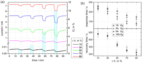 An important result from the time-resolved current measurement is that the response and recovery times, shown in Figure 5b, decrease more rapidly with increasing humidity. In case of 5% oxygen exposure, the difference between 10% and 90% r.h. amounts to 153 ± 38 s for the response time and 513 ± 93 s for the recovery time. Together with the improved signal-to-noise ratio in the current, this is a clear indication of the improvement in oxygen sensing with Pt/PEO-TiO in the presence of water vapor.