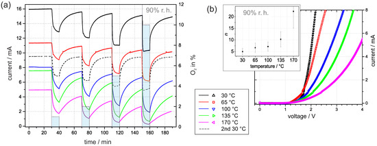 (a) Current transients at 3 in 90% r.h. at temperatures between 30 and 170 . The time with oxygen addition was 10 min and the time between oxygen exposure was 30 min. (b) The corresponding I–V curves were recorded immediately after the transients. The inner graph shows the dependence of the corresponding ideality factor n on temperature. The error bars are estimated based on fitting the standard error.