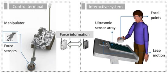 Ultrasonic phased array formation can form a focal point, and the acoustic radiation pressure generated by it can be effectively sensed by the skin. Compared with other tactile interaction methods, ultrasonic tactile feedback does not require wearing or touching the device. Relevant studies conducted by the University of Tokyo and Johns Hopkins University in Japan have shown that ultrasonic phased arrays have reliable aerial tactile interaction effects [21,22,23]. The ultrasonic phased array can generate multiple movable focal points in space to meet the needs of movement perception and can realize independent force feedback of a single finger. Many laboratories have developed experimental prototypes and semi-commercial products for related research, and researchers have also focused on related human perception and application levels. Sand et al. proposed an aerial tactile feedback system for head-mounted displays, which installed array and hand position sensors on the front surface of the head-mounted virtual reality display [24]. Through the participants completing simple virtual key tapping tasks with or without tactile feedback, the experiment proved that participants had a higher evaluation of self-performance through tactile feedback. Some researchers have also applied ultrasonic tactile feedback in the home environment to simulate the touch perception of a light switch. As far as we know, there is no research on the application of ultrasonic tactile feedback in teleoperation systems.