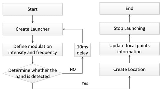 Ultrahaptics’ SDK (Software Development Kit) integrates functions such as focus position, controller launch, modulation, etc., to facilitate design and programming. When transmitting ultrasonic waves into space, amplitude modulation API (Application Programming Interface) that uses sinusoidal signals is used to modulate the ultrasonic waves. When using the AM (amplitude modulation) API, you can continuously send control information, including the modulation frequency, focus position, and focus the intensity of the ultrasound. For the generation of focus, the process mainly includes: creating Ultrahaptics transmitter, defining modulation frequency and intensity, creating control point position, and continuously updating control point information. The process sequence is shown in the Figure 2.