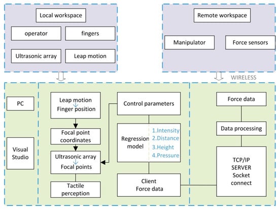 The proposed system uses an ultrasonic phased array for dynamic tactile feedback in a robot teleoperation system. The control terminal completes the contact force detection, and the interactive end presents a dynamically changing contact force through an ultrasonic phased array. The PC side completes data processing, transmission and equipment control. The specific technical roadmap is shown in Figure 3. leap motion is needed to determine the focus position, which captures the position of the finger and transmits it to the ultrasonic array control program. The focused pressure is related to the real-time contact force of the control terminal. The pressure information detected by the pressure sensor installed by the manipulator can be transmitted back to the PC by means of wireless network transmission such as an ad hoc network, and the transmitted pressure information needs to be transmitted to the related program that controls the ultrasonic phased array after processing. We realize the transmission of pressure information through network programming. Under normal circumstances, ultrasonic phased array is only used for force sensing. Using the ultrasonic phased array to achieve force feedback requires a new control method. We built a regression model using three parameters: height, distance from centre, and input intensity. The model inputs the received contact force information and can directly output appropriate control parameters to control the ultrasonic array to present a matching tactile focus. The specific construction method of the model will be introduced in detail in the third section.