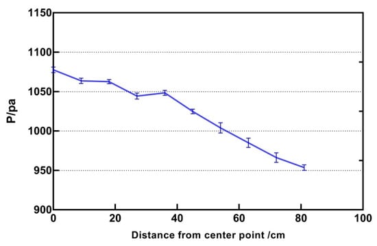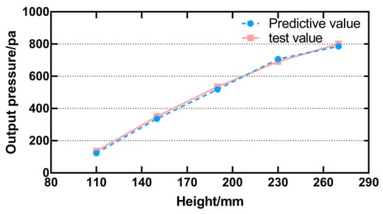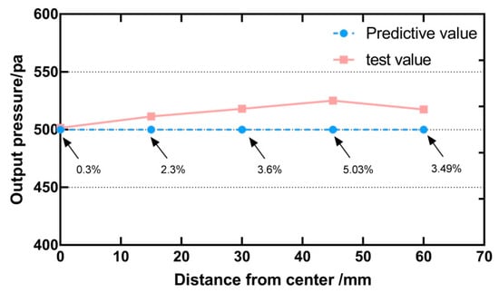 The height of the selected points in the first group was 250 mm, and the distance from the centre was different. The required output power was set to 500 pa, which was the predicted value. The pressure value generated by the ultrasonic array using the regression model was the test value. Five data points were tested, the reading started from the centre, with a step length of 15 mm, and the experimental results are shown in Figure 13. There is a small error between the predicted value and the test value. The errors of the five points are 0.3%, 2.3%, 3.6%, 5.03%, and 3.49% respectively. The average error is 2.94%. Result of the repeated measures ANOVA shows that there were significant differences between the predicted value and the test value [F (1, 4) = 13.88, p < 0.05].
