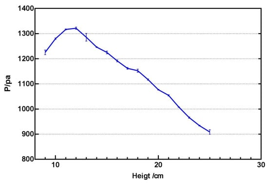 When studying the influence of the height parameter, a similar experiment was conducted, keeping the frequency at 240 HZ, keeping the distance from the centre at 0 mm, and setting the input intensity to 1. Experiments found that there were many interference points between ultrasonic waves in areas with a height of less than 9 cm, and the perception of the focus with the hand will be greatly interfered with. The spatial perception of heights above 25 cm will be weakened, which is not conducive to tactile perception. The working area should be set between 9–25 cm. It is observed from experimental Figure 7 that the relationship between the two is non-linear, and the output pressure intensity will decrease as the height increases.