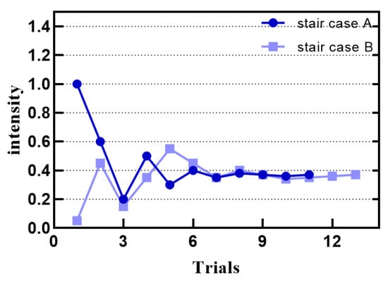 We conducted experiments by adaptive ladder program with variable step length “1up-2down”. The experiment was divided into stair case A and stair case B. At the beginning of the experiment, in experiment A, the subjects were provided with higher intensity stimulation, and in experiment B, the subjects were provided with lower stimulation. The duration of the stimulus was about 3 s. The participant was asked if they feel the stimulus. If the participant answered yes twice, the stimulus level would be reduced by one level. If the participant answers no, the stimulus level would be increased in the next test. After each reversal, the stimulus step length was reduced to ensure a more accurate adjustment. The experiment was stopped after eight reversals, and the average value of the stimulus level at the point of the last four reversals was the absolute threshold. The step size is 0.4, 0.3, 0.2, 0.1, 0.05, 0.03 and 0.01.