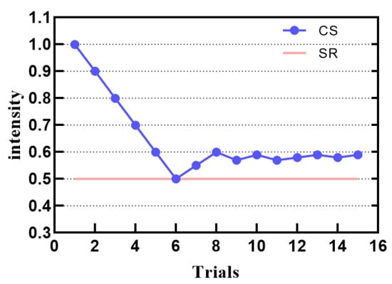 In the differential threshold experiment, participants were required to compare the two stimulus intensities and answered whether they feel the difference between them. Each test included the first stimulus reference (SR) and comparative stimulus (CS). Each test stayed for 3 s. In the first experiment, the two stimuli were chosen to have larger differences. Participants were asked whether they felt the difference, and the participants answered yes that the stimulation level would decrease in the next stage, and vice versa, the stimulation level would increase. Every time the response result changed, we made the stimulus step smaller to make the adjustment more convenient and accurate. The steps used are 0.5, 0.4, 0.3, 0.2, 0.1, 0.05, 0.03, and 0.02. Similarly, after eight reversals, the differential threshold is calculated based on the average of the last four reversal points.