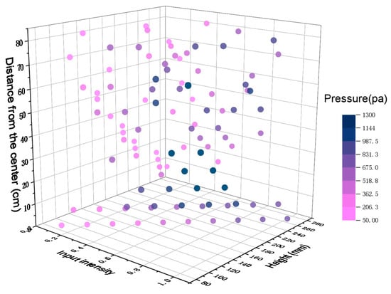 According to our experience when the ultrasonic phased array is arranged in a square, our actual test data do not need to cover the entire space, and we select typical representative points in the horizontal and vertical directions for testing. The tested data points are shown in Figure 10. The three coordinate axes are the input command intensity, height, and distance from the centre. The pressure at each data point is indicated by colour. The test data set is used for multiple regression. Formula 1 represents the regression model, where P is the output sound pressure value, a is the input command intensity, z is the height, and d is the distance from the centre.
