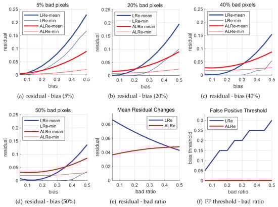Bad pixel residuals of linear regression with and without equality constraint. Marked as ALRe and LRe, respectively. (a–d) Mean and minimal residuals of bad pixels with different biases; (e) Mean residuals of bad pixels under different configurations of bad pixel ratio; (f) Under different bad pixel ratios, the thresholds that pixels with smaller biases might have zero residuals.