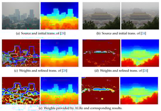 Transmission map refinements. Transmission and weight maps are displayed in color. The warmer the color, the larger the value. (a,b) Hazy images and the initial transmission maps based on dark channel prior [27] and haze-line model [24] respectively; (c,d) The weight maps and the refined results based on Zhu et al. [28] and Berman et al. [24] respectively; (e) The weight maps based on ALRe and corresponding results.